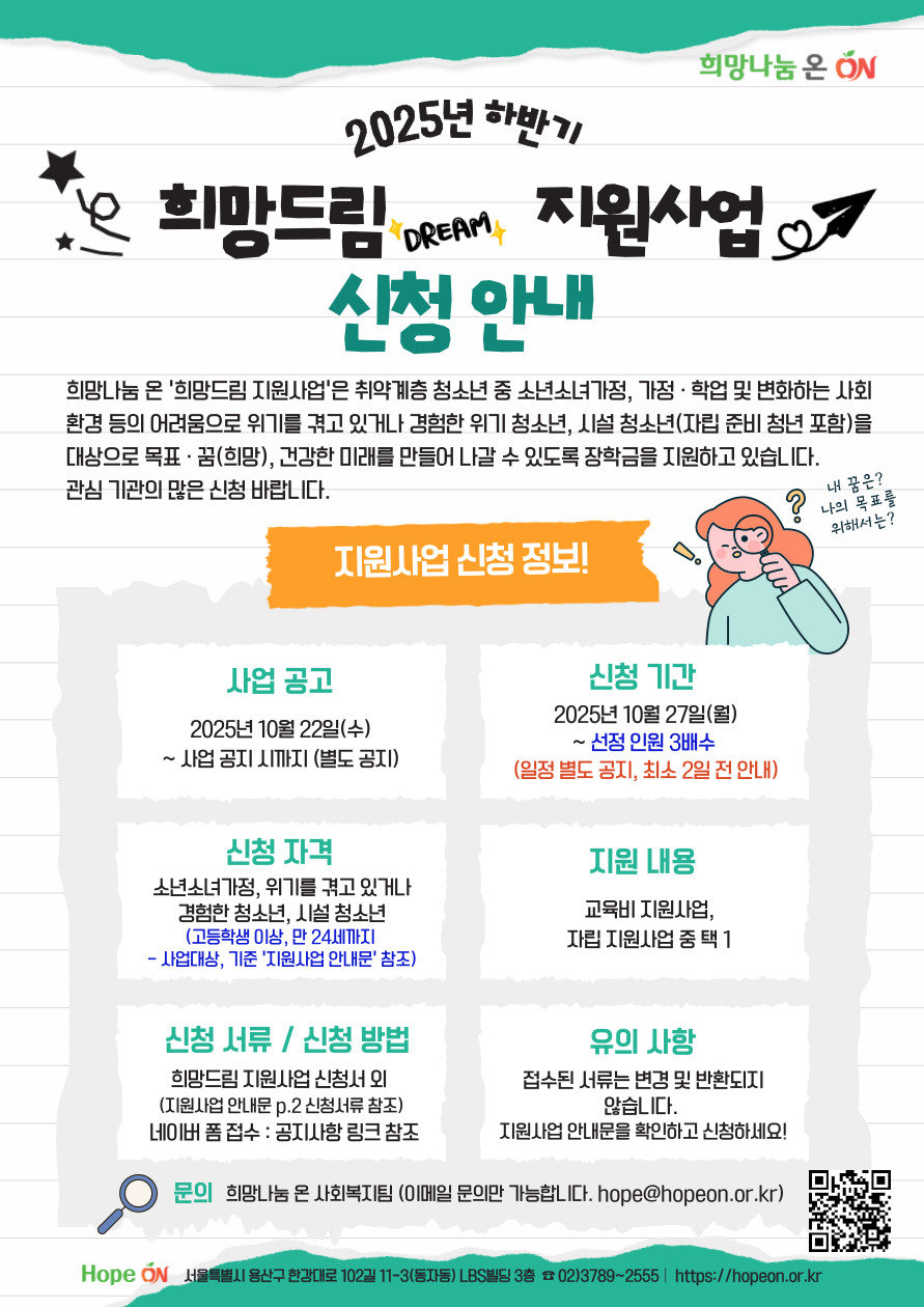 희망나눔 온에서는 「2025년 하반기 희망드림(Dream) 지원사업」을 공고하오니, 지원사업에 도움이 필요한 해당 청소년이 있는 기관에서는 많은 관심과 참여 신청 바랍니다.