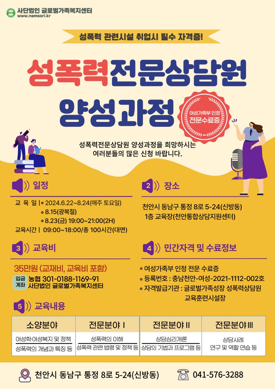 ☞ 문 의 : 글로벌가족성장 가정 성폭력상담원 교육훈련시설 041-576-3288