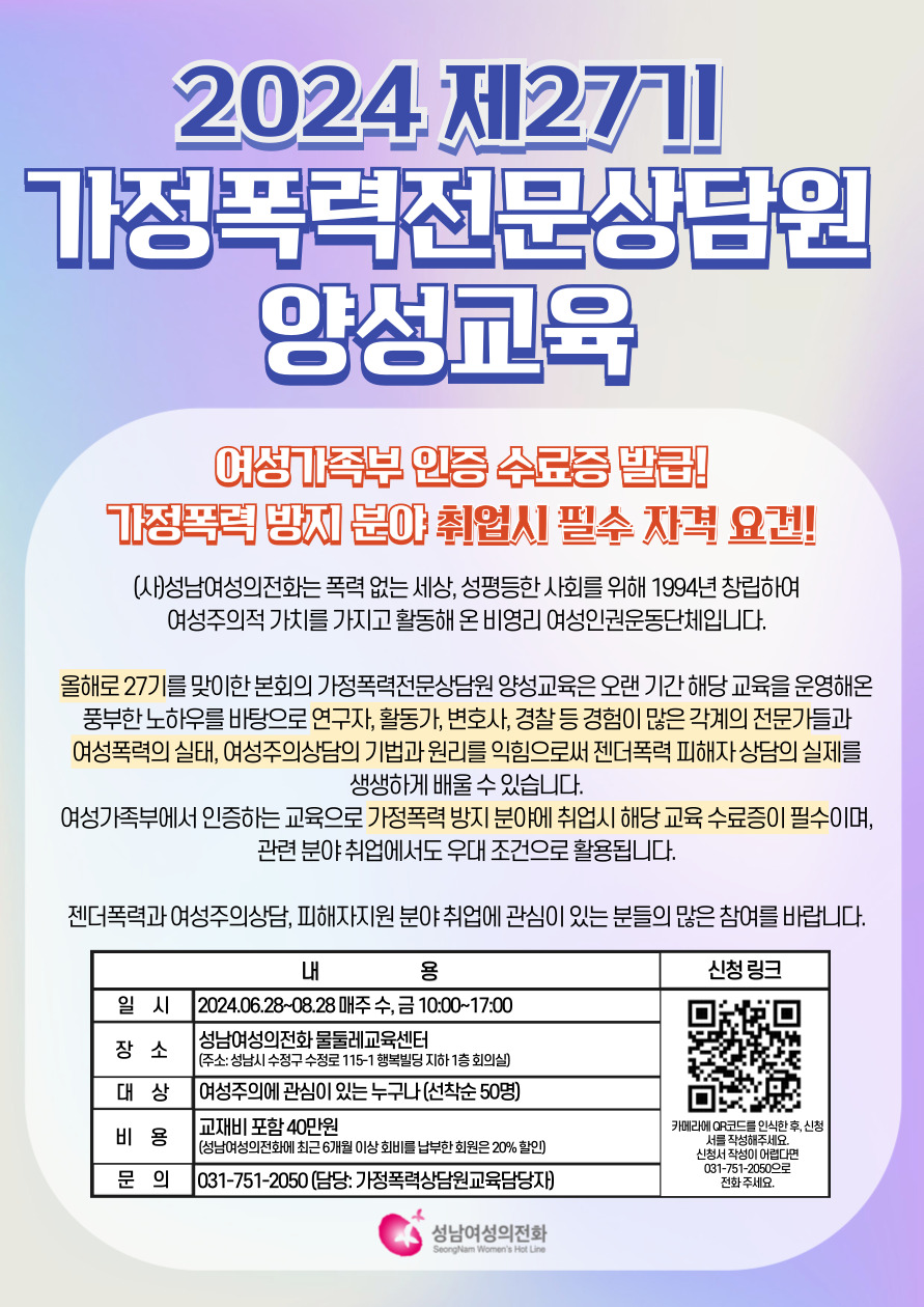 2024년 제27기 가정폭력전문상담원 양성교육 안내문.hwp (141.5K)