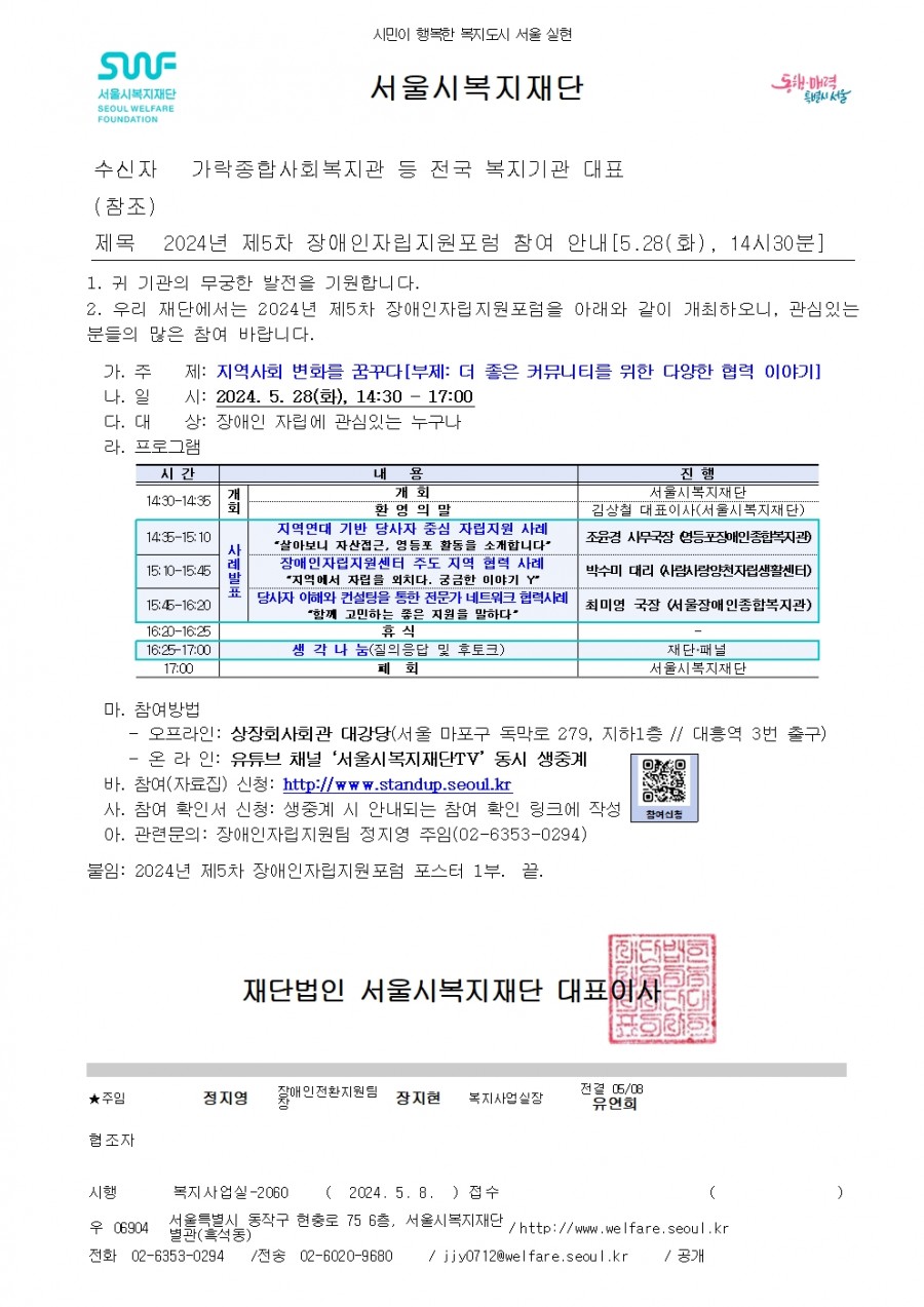 녹음이 짙어지는 5월, 서울시복지재단에서는 2024년 제 5차 장애인자립지원포럼을 개최합니다.