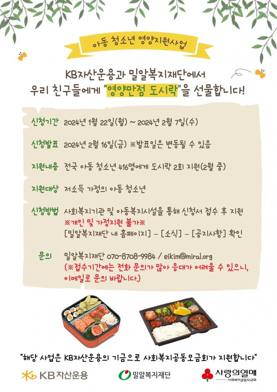 [밀알복지재단] KB자산운용과 함께하는 아동 청소년 영양지원사업 관련 건(도시락 지원) ( ~ 02/07 )