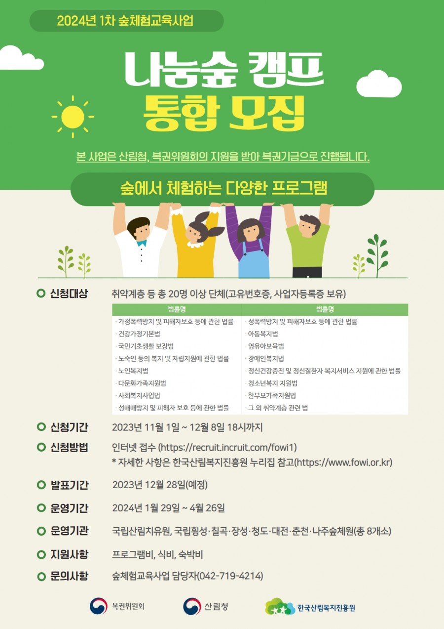 [한국산림복지진흥원] 2024년 1차 숲체험교육사업 「나눔숲캠프」 참가 모집공고 ( ~ 12/08)