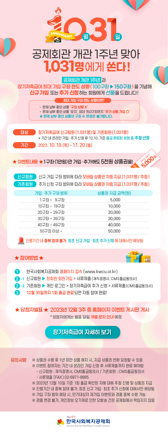 [한국사회복지공제회] 공제회관 개관 1주년 기념 「1,031명에게 쏜다!」 ( ~ 11/20)