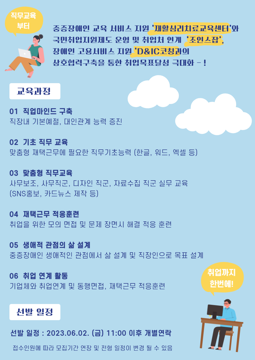 [2023 일반지역산업맞춤형 일자리 창출 지원사업] 중증장애인 재택근무자 양성과정 모집(~5/31)