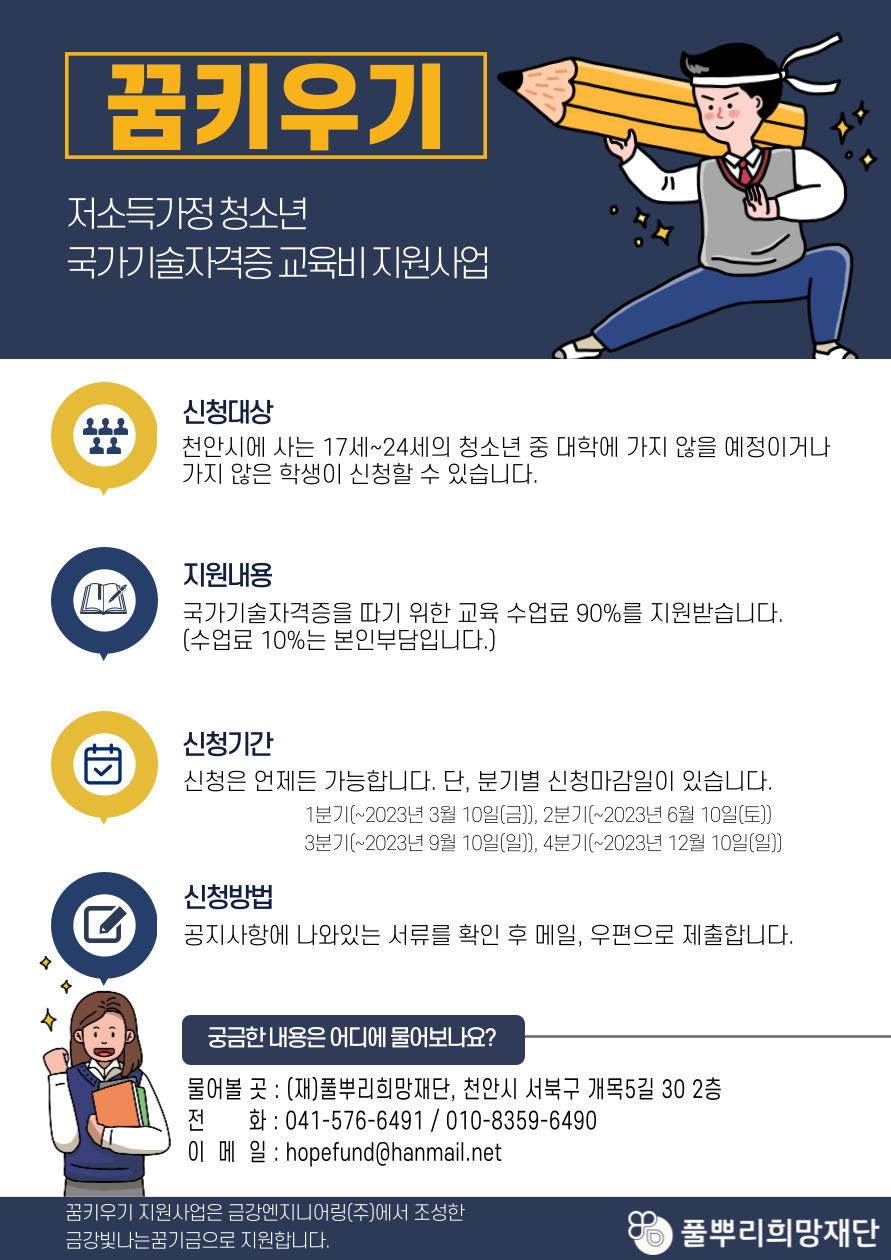 [풀뿌리희망재단] 2023년 '꿈 키우기' 지원사업 신청안내 (저소득가정 청소년 국가기술자격증 교육비 지원)(상시)