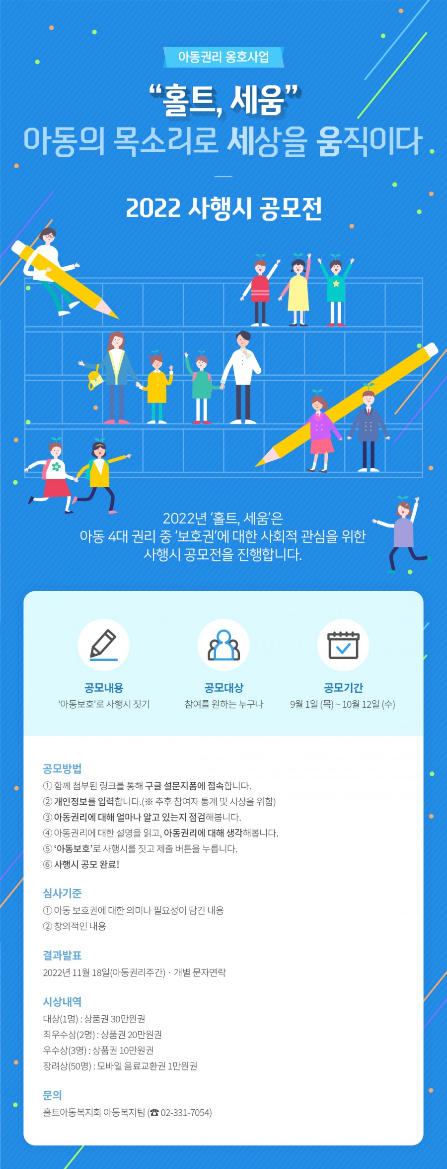 [홀트아동복지회] 아동권리옹호사업 '홀트,세움' 2022 사행시 공모전(~ 10/12) 페이지 정보 작성자 관리자 댓글 댓글 0건 조회Hit 8,400회 작성일Date 22-09-02 18:12 본문 관련링크 http://(https://forms.gle/6amnVbxAJk5vr7zS7 6292회 연결 목록 이전글[아산사회복지재단] SOS복지지원사업 안내(상시) 22.09.05 다음글[우양재단] 2022년 비수도권 지역 조손가정 주방용품 지원사업 안내(~9/8) 22.09.02 댓글 0 댓글목록 등록된 댓글이 없습니다.