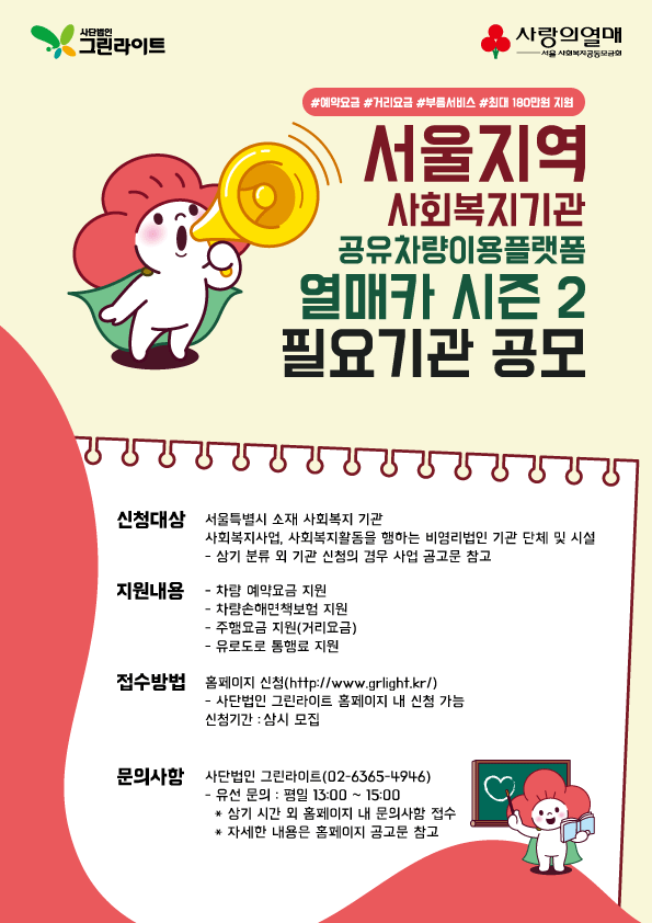 "열매카 시즌2" 서울지역 사회복지기관의 업무편의를 위한 쏘카 및 g카 등 공유차량 이용비용을 지원하고 있습니다. (●'ᴗ'●)ノ♥