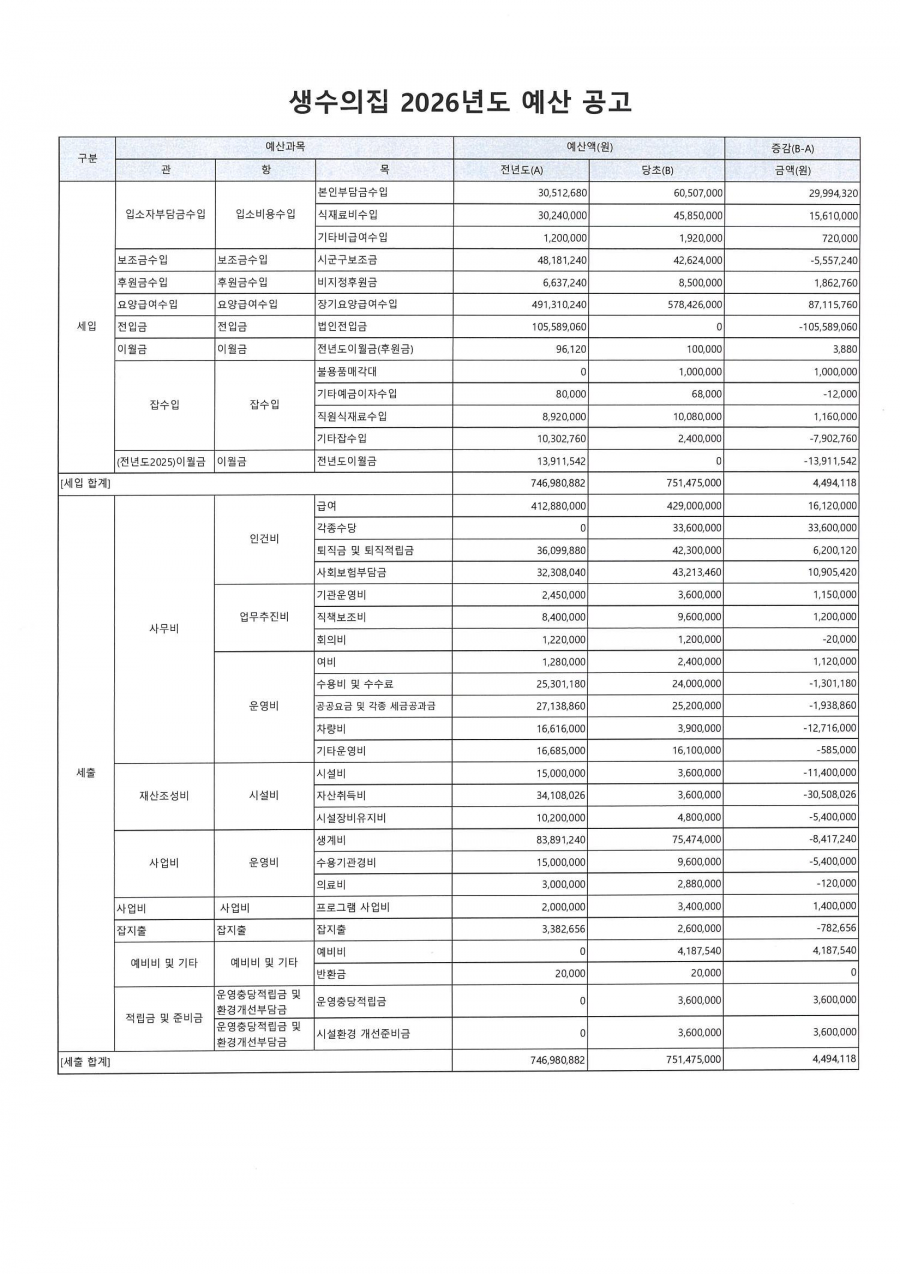생수의집 2026년 예산공고 페이지 정보 작성자 김영민 댓글 댓글 0건 조회Hit 34회 작성일Date 26-03-20 17:25 본문 생수의집 2026년 예산공고 목록 이전글2026년 예산서 공고(북익산소망의집) 26.03.26 다음글2026년 쉼터요양원 예산 공고 26.03.14 댓글 0 댓글목록 등록된 댓글이 없습니다.