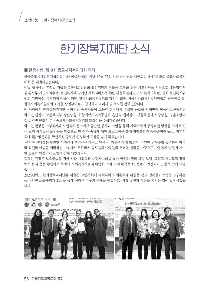 이번 한기장복지재단 소식은 ' 한종사협 제18회 종교사회복지대회 개최', '기장교회와 함께하는 복지선교, 지속해야 할 사명입니다.', '2024 신년하례회 및 사회복지종사자대회' 내용이 게재되었습니다.