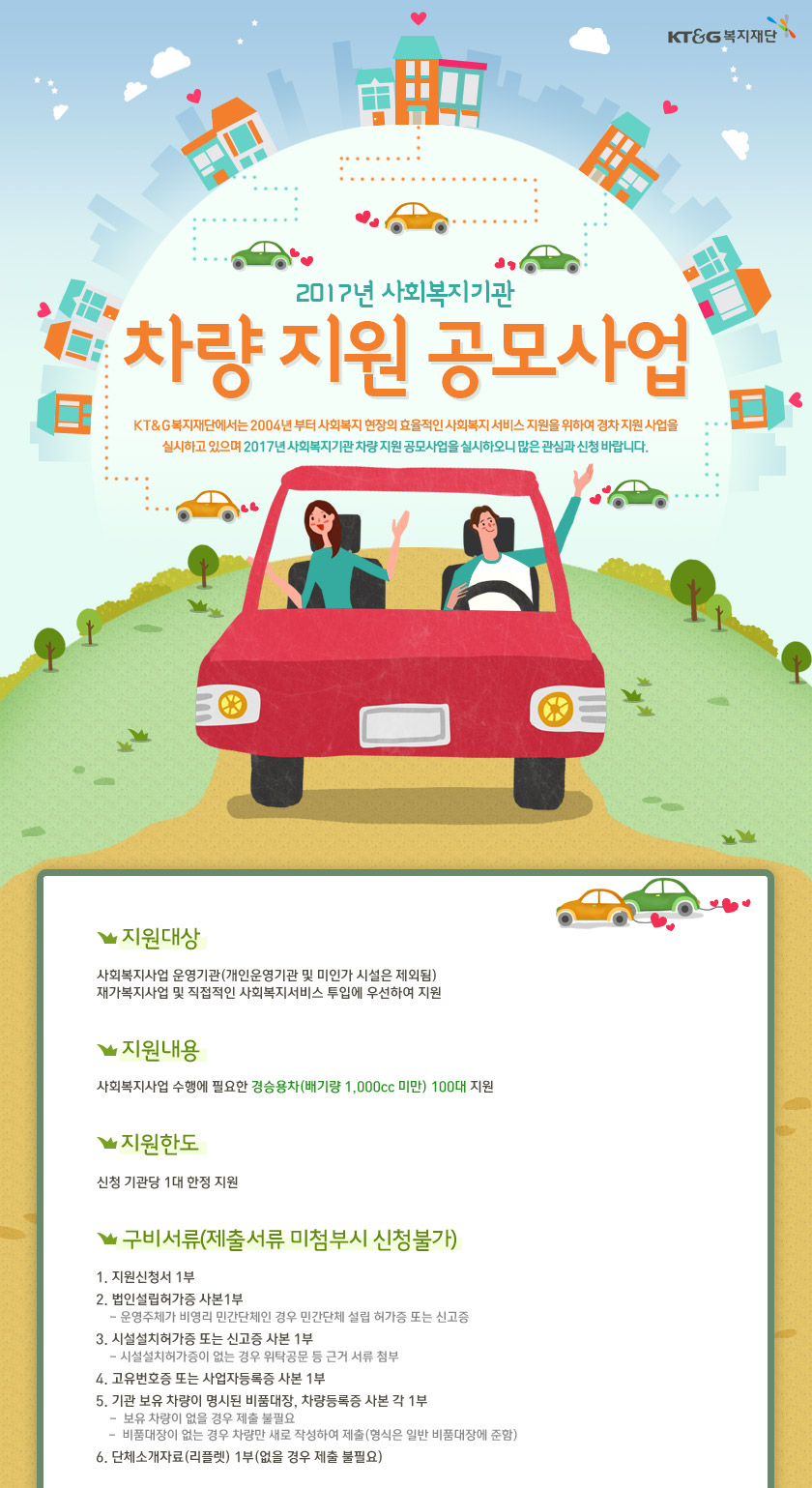 [공모]2017년 사회복지기관 차량지원공모사업 안내 페이지 정보 작성자 관리자 작성일17-06-28 09:05 조회8,799회 댓글0건 관련링크 http://www.ktngwelfare.org/notice/supportVehicles/info_2017 6049회 연결 이전글 다음글 목록 본문 댓글목록 등록된 댓글이 없습니다. 이전글 다음글 목록