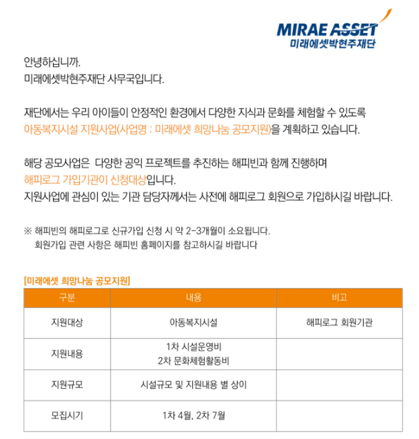 [미래에셋박현주재단] 2023 미래에셋 희망나눔 공모 일정 사전 안내(상시) 페이지 정보 작성자 관리자 작성일23-02-09 14:44 조회8,029회 댓글0건 관련링크 https://foundation.miraeasset.com/ko/news/notice/list.do?listCnt=6&pag… 5150회 연결 이전글 다음글 목록 본문 댓글목록 등록된 댓글이 없습니다. 이전글 다음글 목록