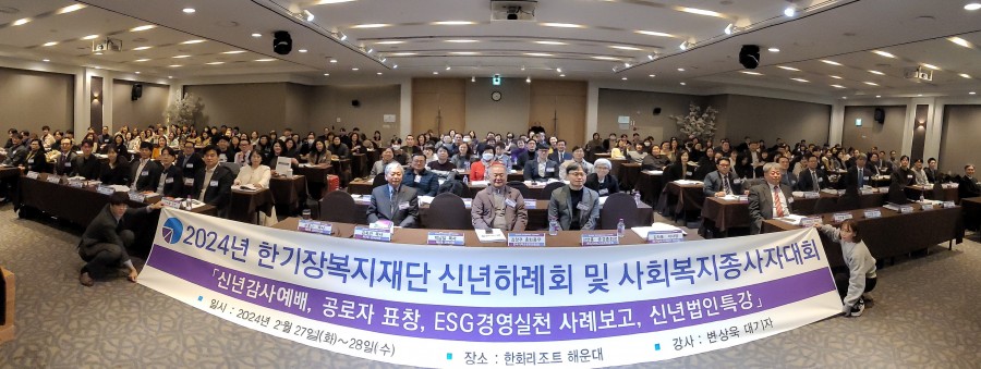 한기장복지재단(이사장 김희웅 목사)은 지난 2월 27일(화)~28일(수) 양일간 해운대 한화리조트에서 2024년 신년하례회 및 사회복지종사자대회를 개최하였습니다. 전국의 한기장 소속기관 시설장 및 종사자, 법인 임원, 분사무소, 후원협력교회, 후원사 관계자 등 220여 명이 모인 이날 행사는 신년감사예배, 신년인사, 공로자 표창, 신년법인특강, 신년콘서트, ESG경영실천 우수사례 발표 및 시상 순서로 진행되었습니다.