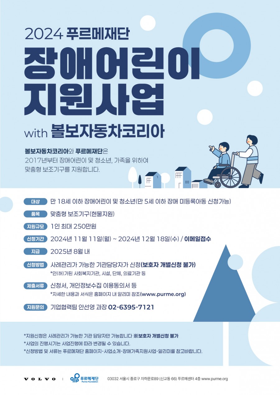 [푸르메재단] 2024 볼보자동차코리아 장애어린이 보조기구 지원사업 신청안내 ( ~ 12/18)