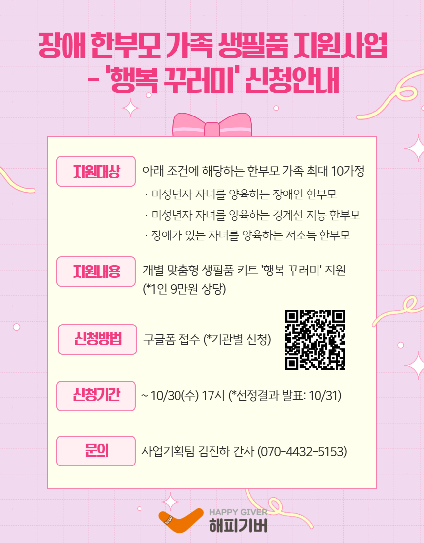 [사단법인 해피기버] 2024 장애 한부모 가족 생필품 지원사업 - 행복 꾸러미 신청 안내( ~ 10/30)