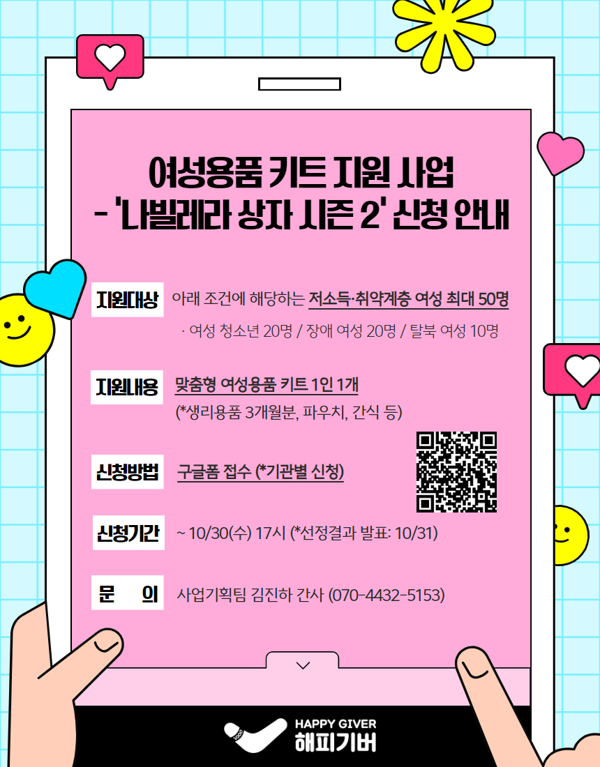 [사단법인 해피기버] 2024 여성용품 키트 지원 사업 - 나빌레라 상자 시즌 2 신청 안내( ~ 10/30)