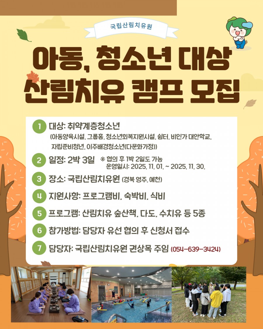 [국립산림치유원] 11월 아동 및 청소년 대상 산림치유캠프 참가자 모집(~11/30)
