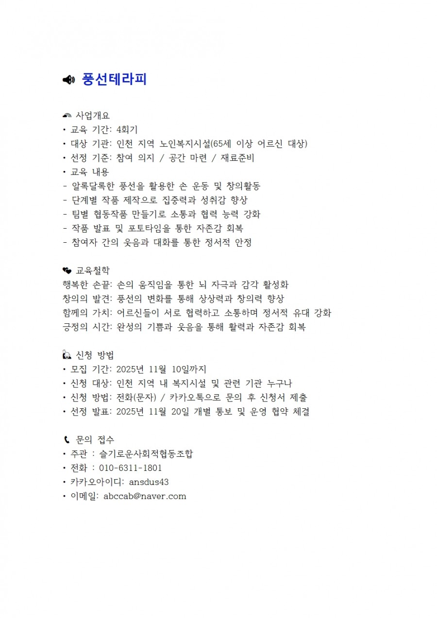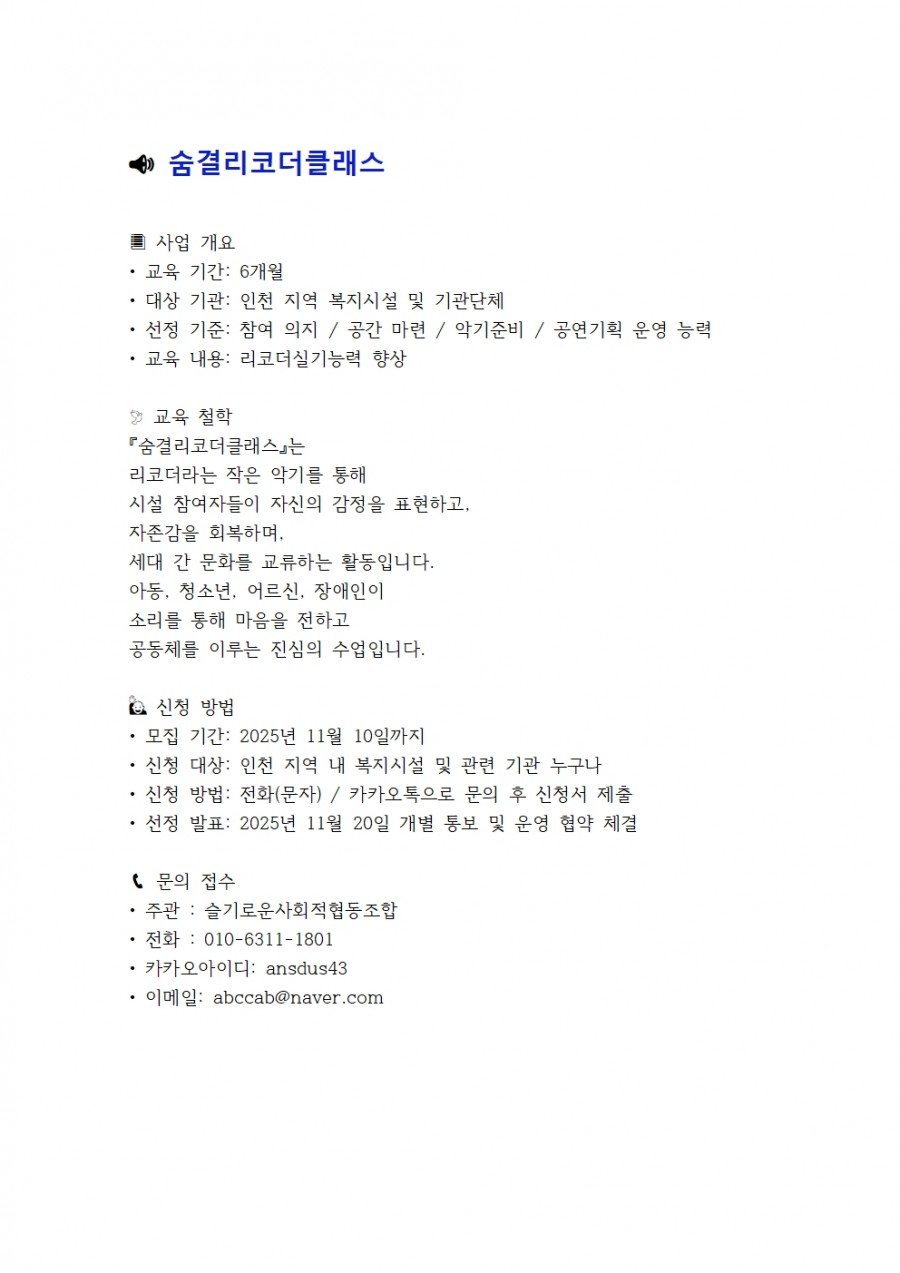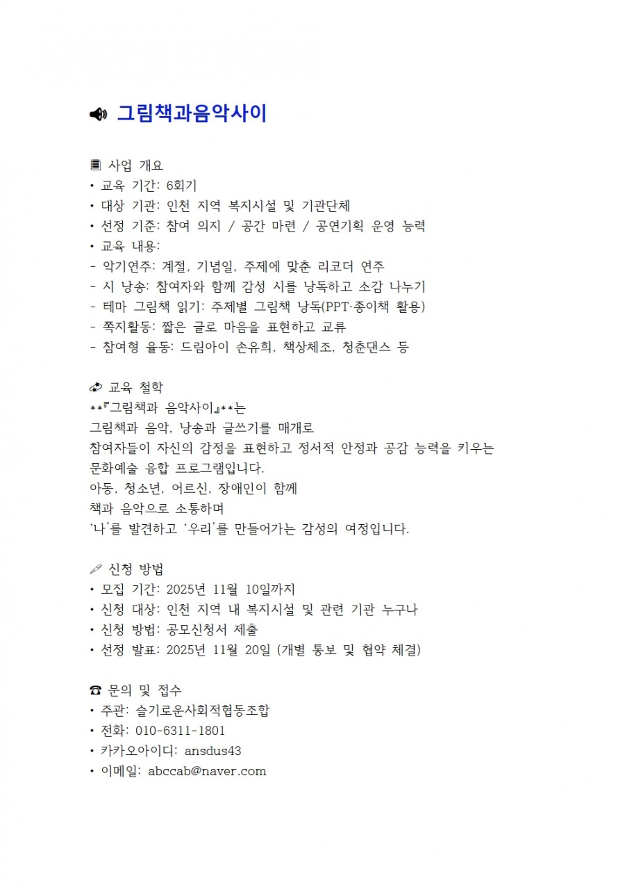 [슬기로운사회적협동조합] 2025.11월 문화밥상(취약계층 문화예술교육프로그램) - (인천지역)(매월)