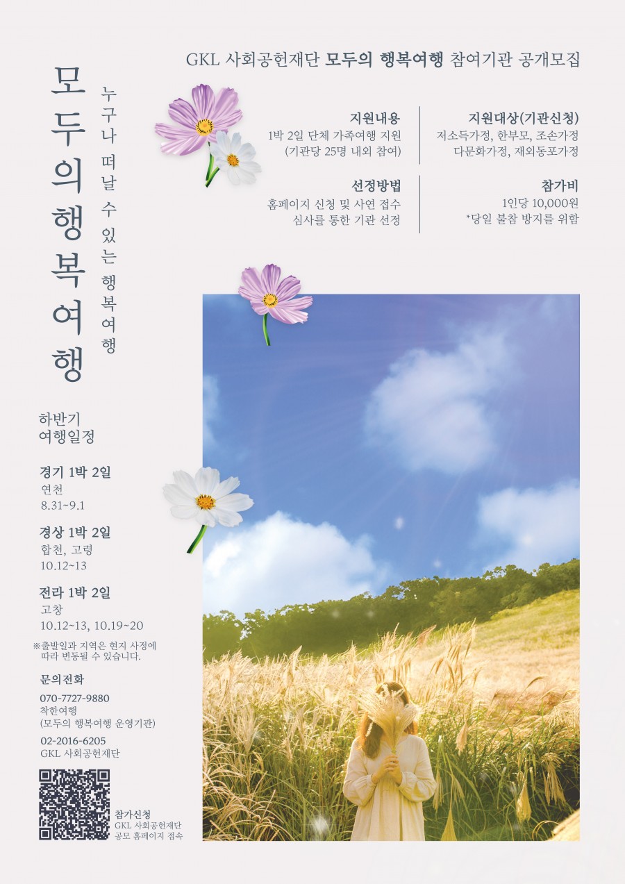 [GKL사회공헌재단] '모두의 행복여행(가족 대상)' 참여기관 모집 (8~10월 여행) ( ~ 07/24) 페이지 정보 작성자 관리자 댓글 댓글 0건 조회Hit 5,796회 작성일Date 24-07-12 14:10 본문 관련링크 https://docs.google.com/forms/d/1KxyWSA91vxzY2wAGfTmw8fe2M4NgIqQdITHNh… 5116회 연결 목록 이전글[김대일문화재단] 2024년 [놀이; 하다] 참여 기관 모집( ~ 상시) 24.07.12 다음글[아름다운재단] 2024 청소년부모 주거지원사업 ( ~ 상시) 24.07.10 댓글 0 댓글목록 등록된 댓글이 없습니다.