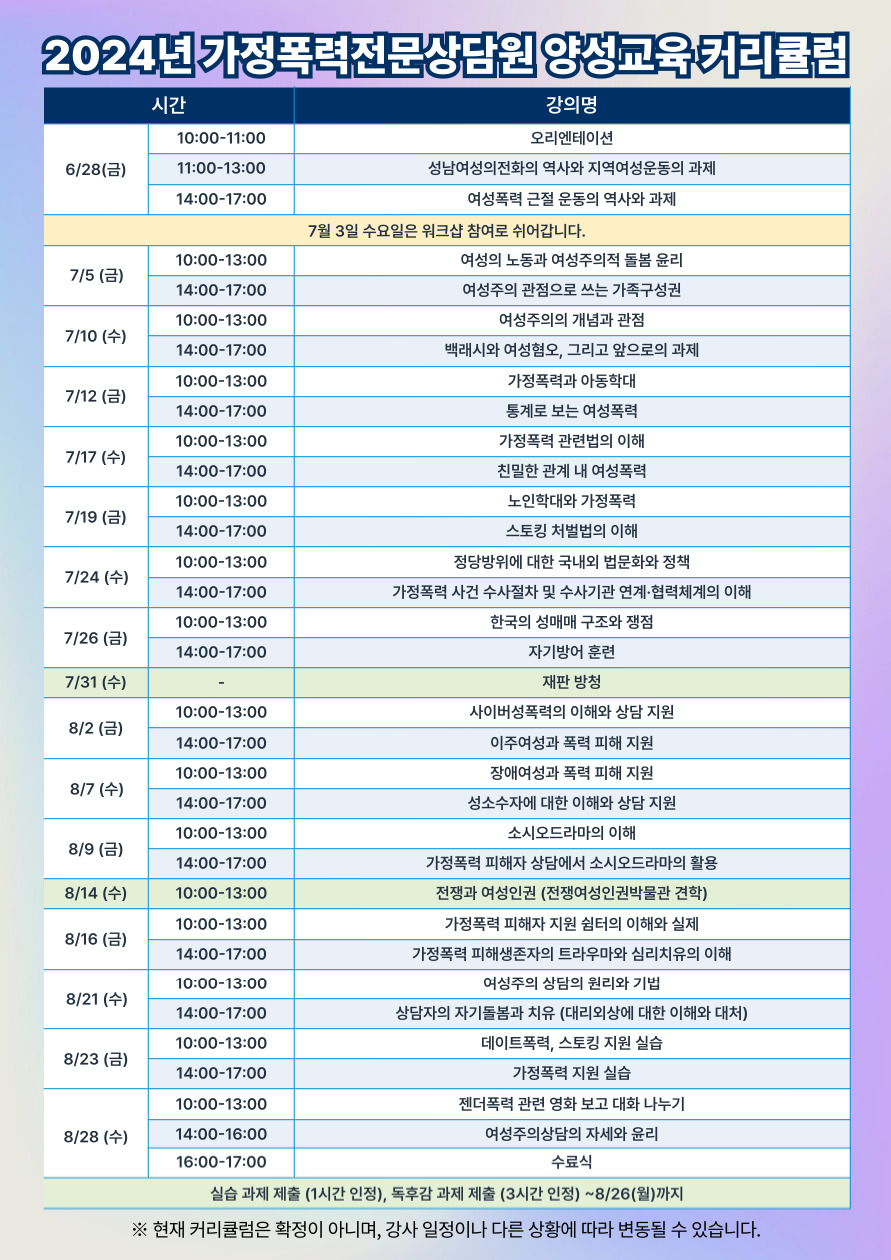 ※ 본 교육은 누구나 수강 가능하지만, 교육과정 수료만으로 상담원 자격을 갖는 것은 아니며, '가정폭력방지 및 피해자보호 등에 관한 법률 시행규칙'[별표3]에 따른 개별기준 또한 갖추어야 상담원 자격이 인정됩니다.