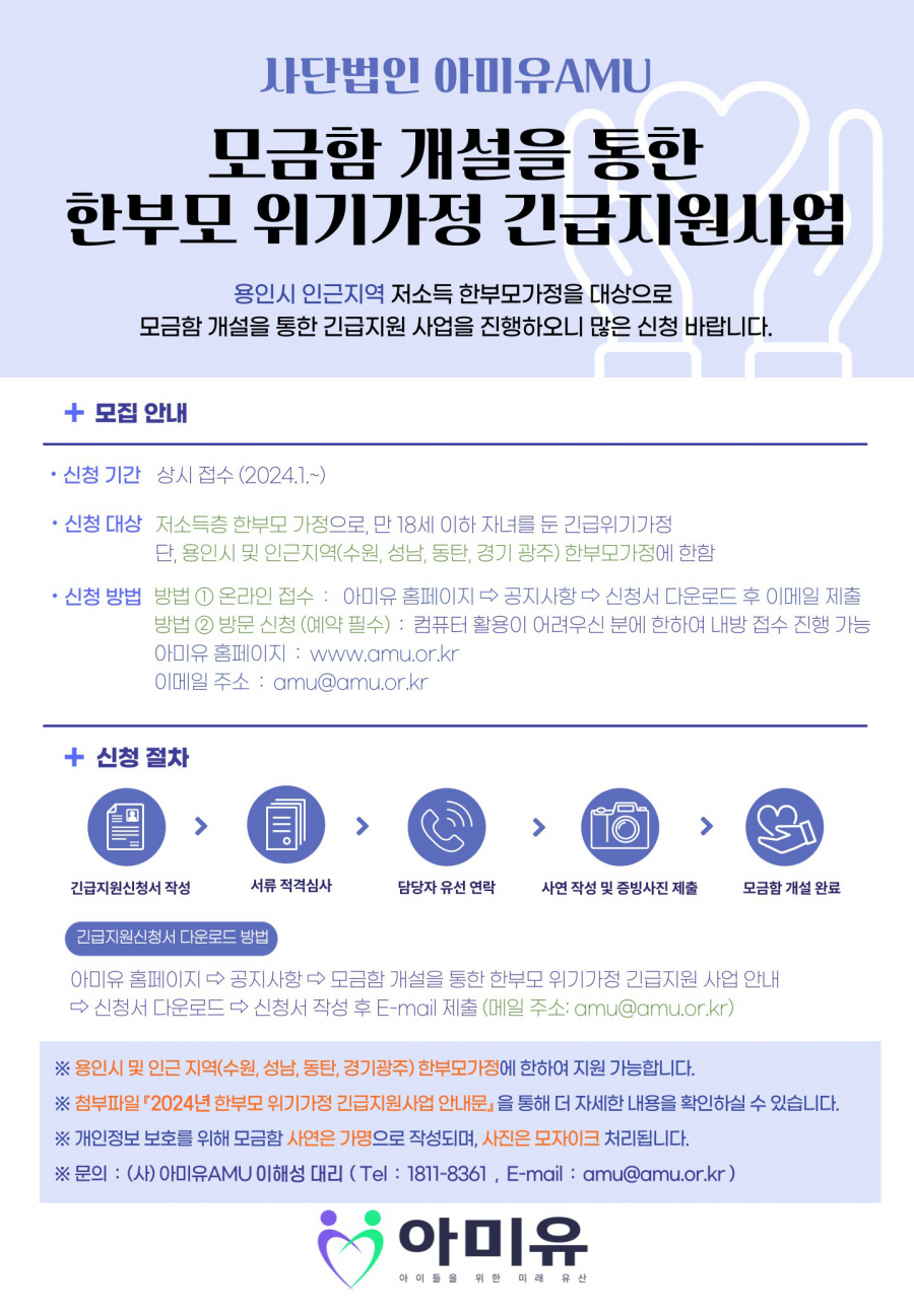 [사단법인 아미유AMU] 한부모 위기가정 긴급지원사업 신청 안내 ( ~ 상시)