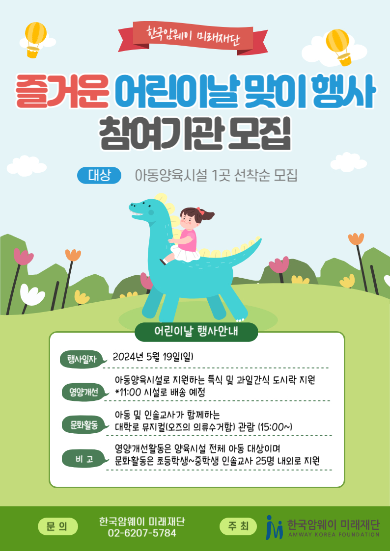 [한국암웨이 미래재단] 어린이날 맞이 행사(특식지원 및 문화예술 기회제공) 참여기관 모집 ( ~ 03/21)