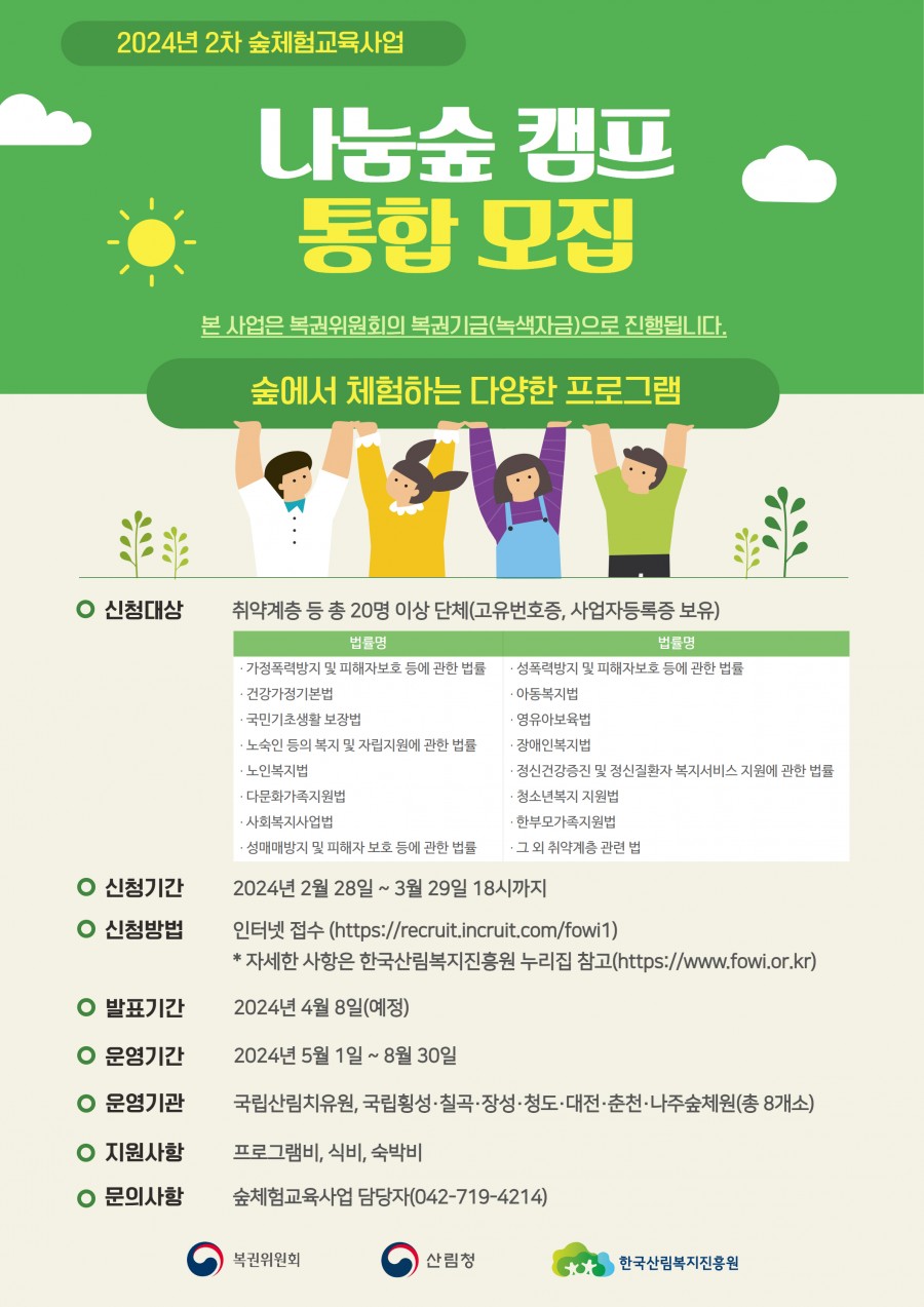 [한국산림복지진흥원] 2024년 2차 숲체험교육사업 「나눔숲캠프」 참가 모집공고 ( ~ 03/29)