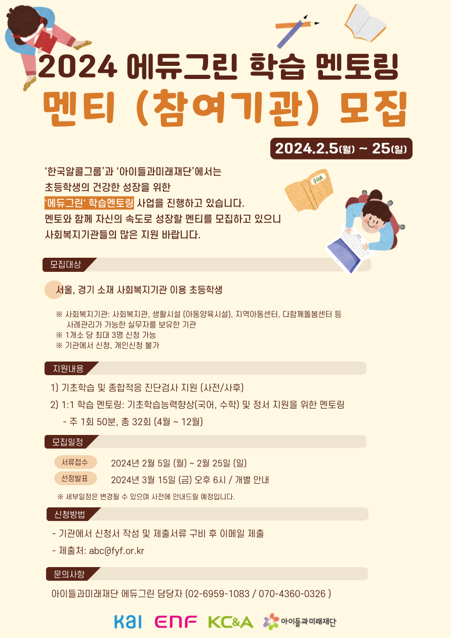 [아이들과미래재단] 한국알콜그룹 에듀그린 학습멘토링 멘티(참여기관) 모집( ~ 02/25)
