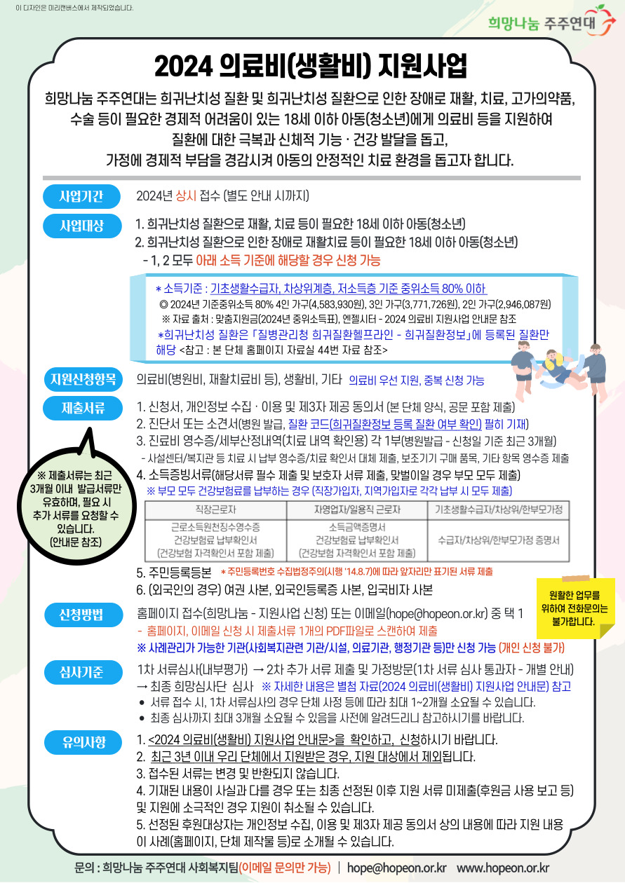 자세한 내용은 <2024년 의료비(생활비) 지원사업 홍보지> 및 <2024년 의료비(생활비) 지원사업 안내문>을 참고해 주시기 바랍니다.