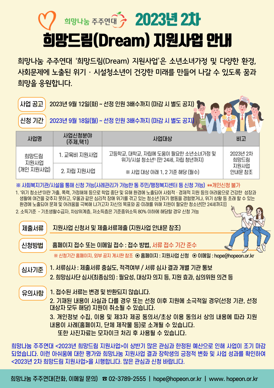 ※ 지원사업 신청 시 본 단체 홈페이지에서 ‘2023년 2차 희망드림 지원사업 안내문’을 다운받아 참고하시기 바랍니다.