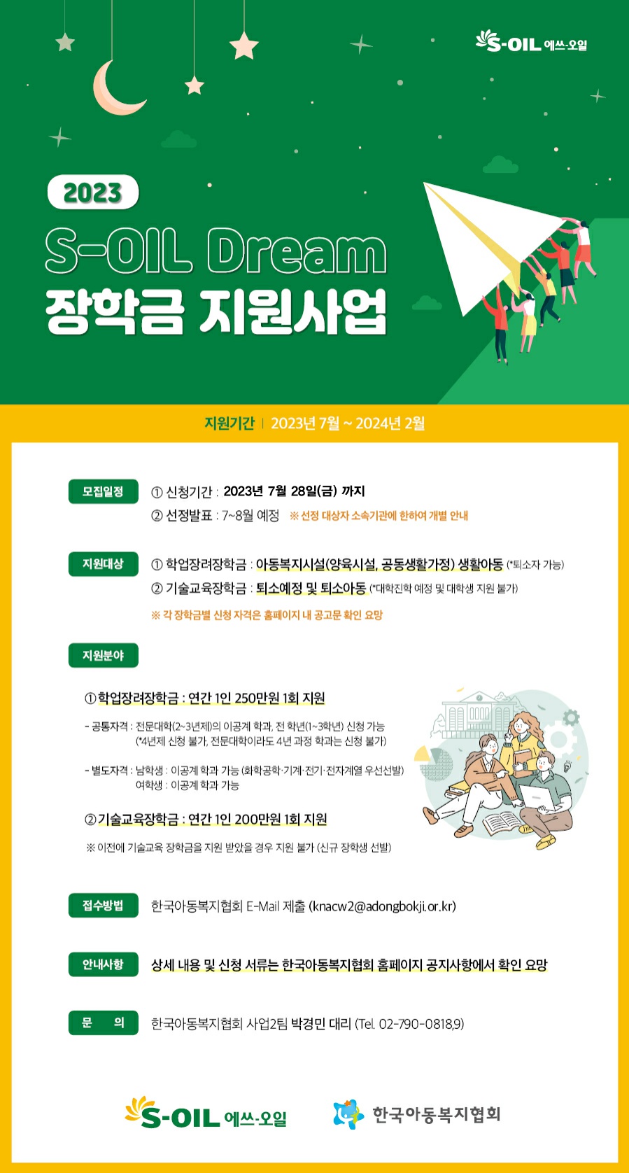 [한국아동복지협회] 2023년 S-Oil Dream 장학금 지원사업 대상자 모집 (~7/28)