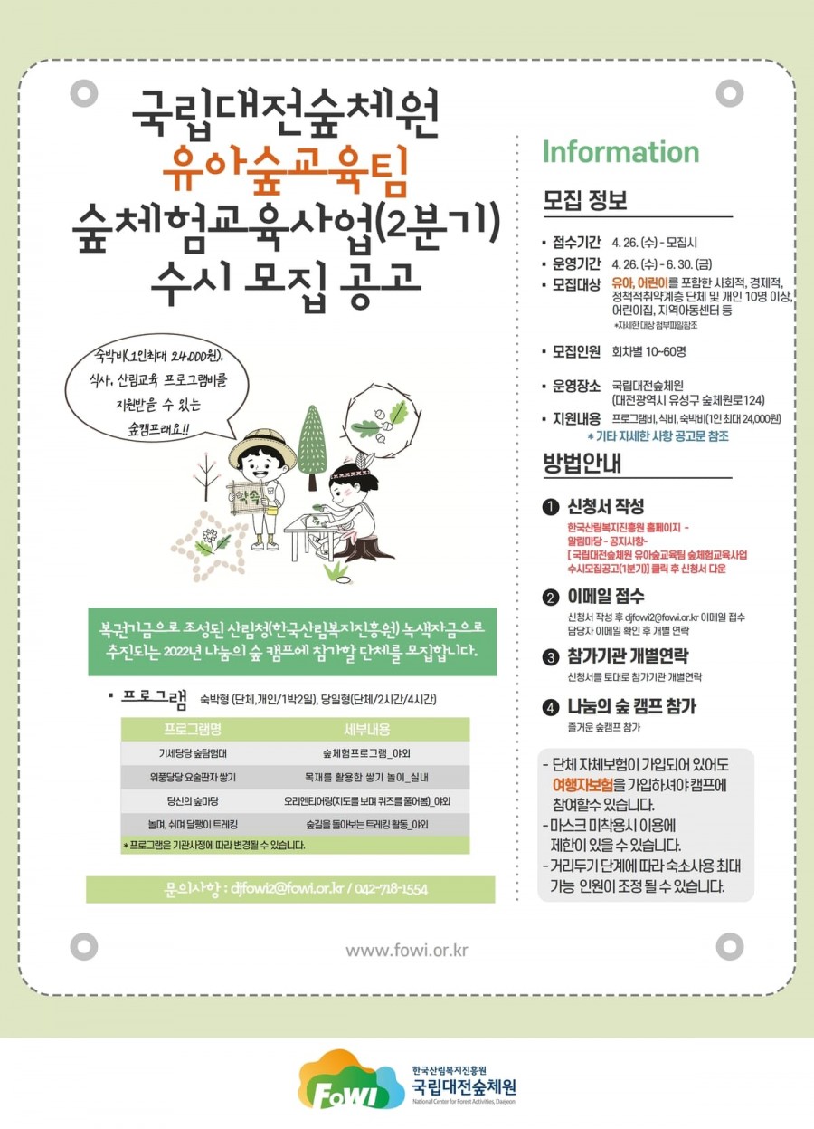 [한국산림복지진흥원]국립대전숲체원 유아숲교육팀 숲체험교육사업 수시모집 공고(2분기)(모집 시)