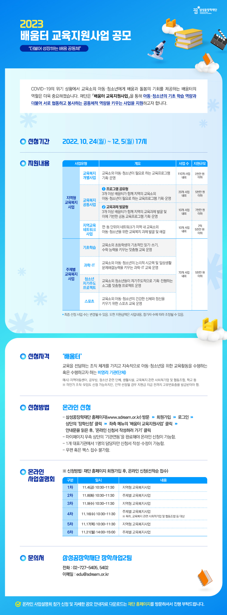[삼성꿈장학재단] 2023년 배움터 교육지원사업 공모(~12/5)