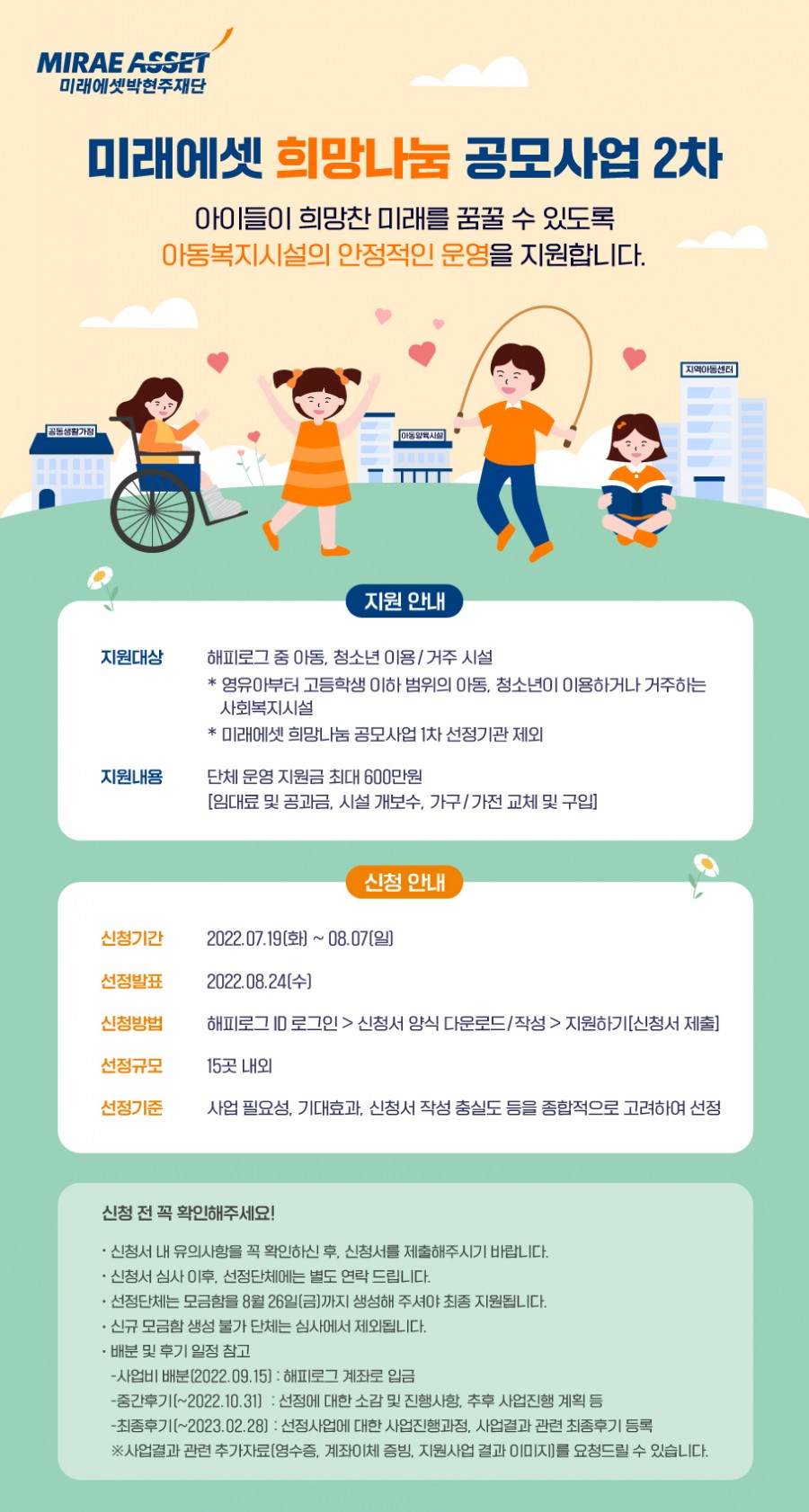 [미래에셋박현주재단] 미래에셋 희망나눔 공모사업 실시(~8/7)
