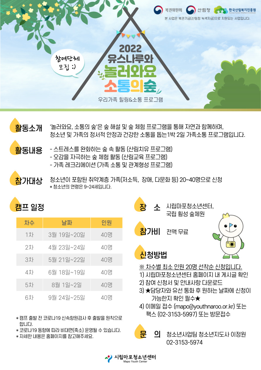 [시립마포청소년센터]2022년 녹색자금 공모사업 '놀러와요, 소통의 숲!' 참가 기관 모집(~