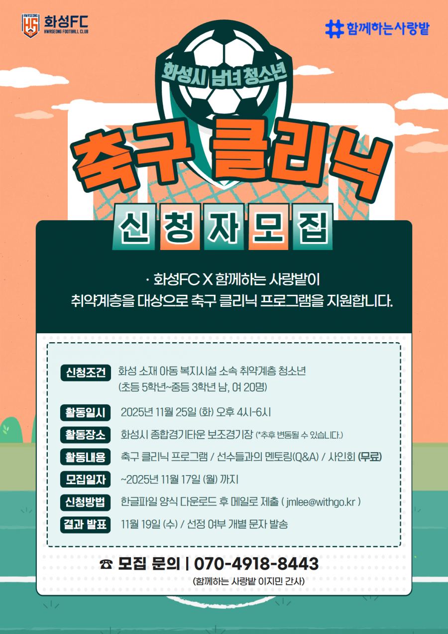 2025년 11월 25일 화요일, 화성 거주 취약계층 청소년들을 위한 무료 축구 교육 프로그램을 진행합니다!
